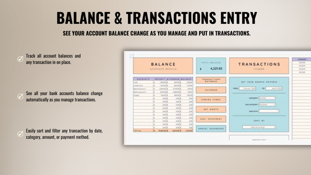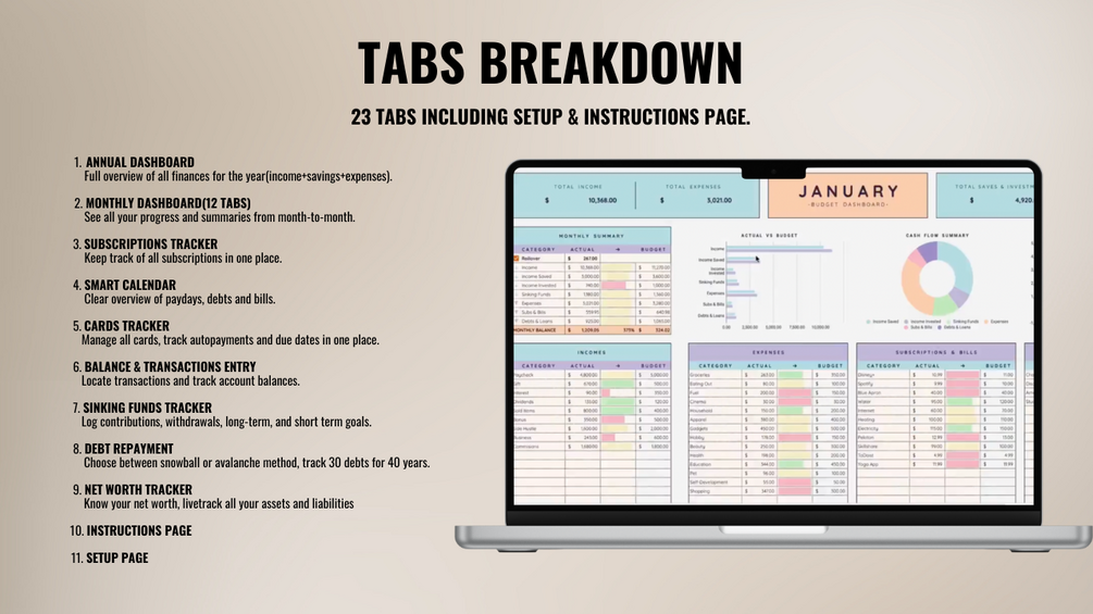 The ultimate financial tool to help you save more, pay down debts, monitor spend, and achieve your financial goals! Just DOWNLOAD, EDIT and START right away!